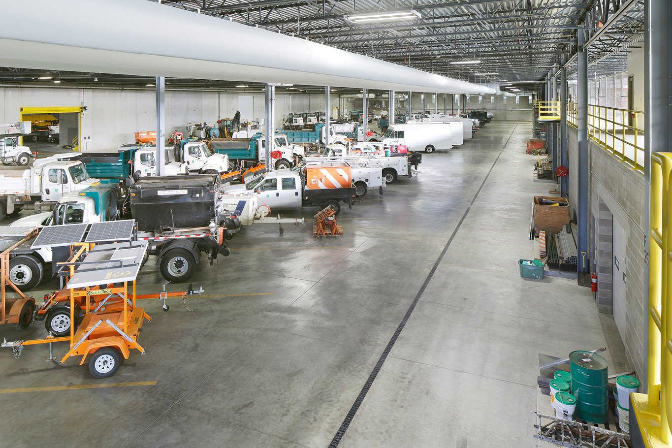 The project features departmental offices, vehicular storage for over 200 small and nearly 200 large vehicles, full-service functions, a vehicle wash bay, fleet offices and locker facilities, a carpentry and sign shop, warm and cold storage, salt storage, and a fuel island.