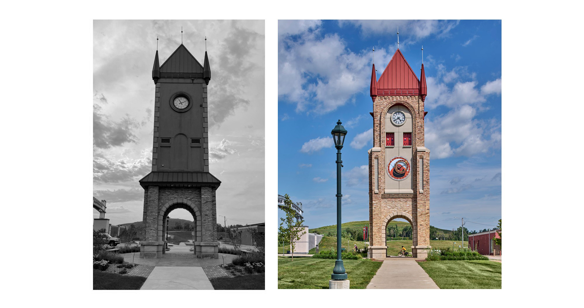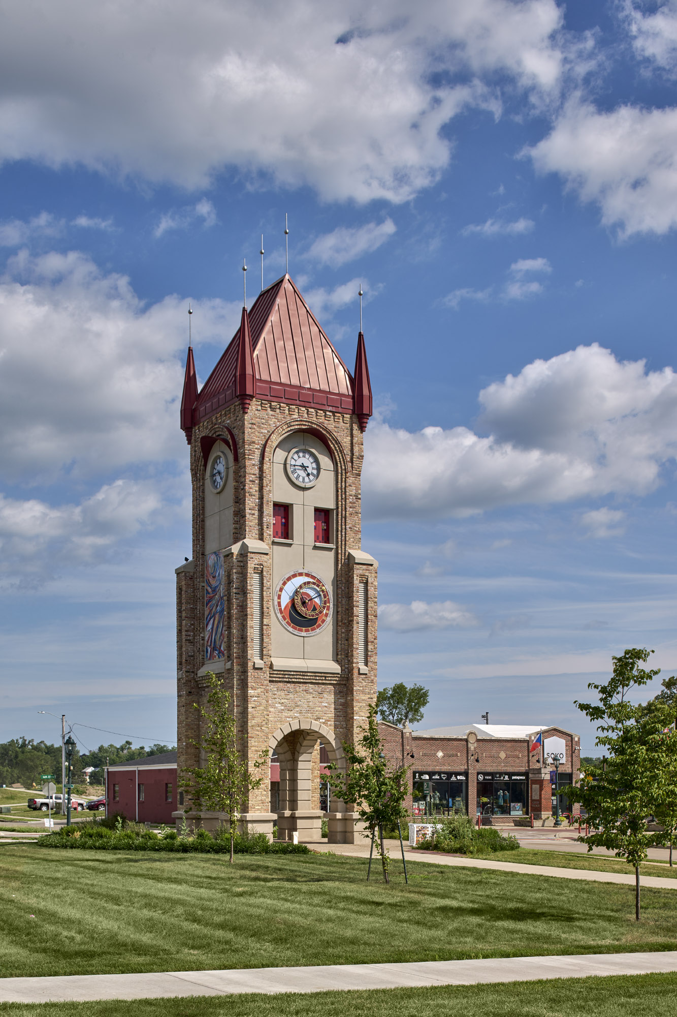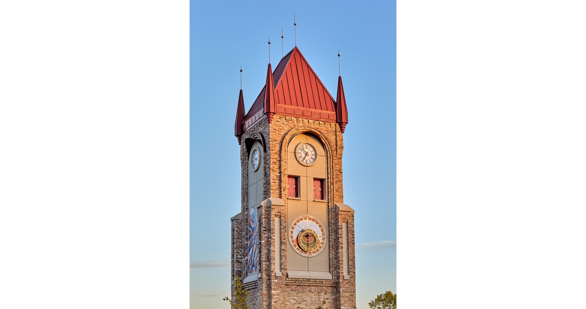 At the museum’s entrance stands the Immigration Clock Tower, a sculptural tribute to immigrant stories. Originally built in 1995, the tower was damaged by the 2020 derecho (and was already in disrepair prior to the storm). Its strategic demolition and reconstruction created an opportunity to infuse the landmark with deeper cultural meaning.