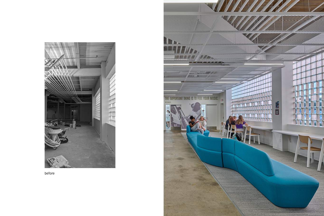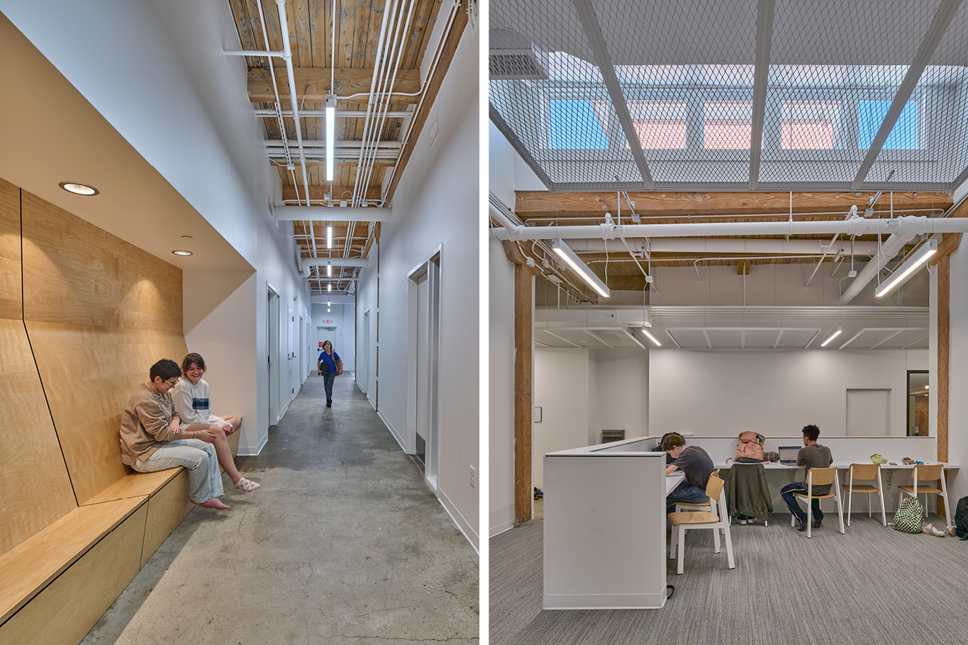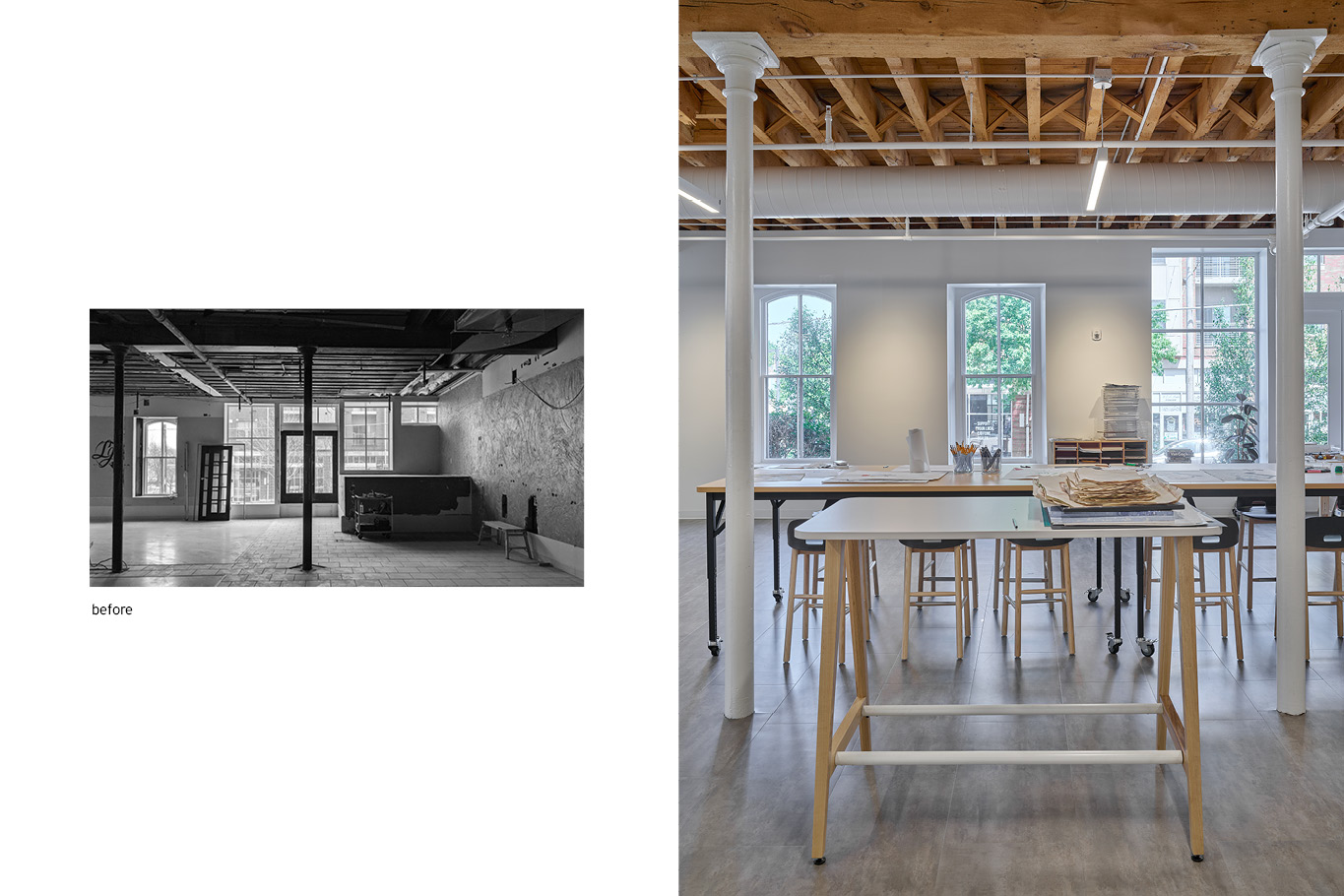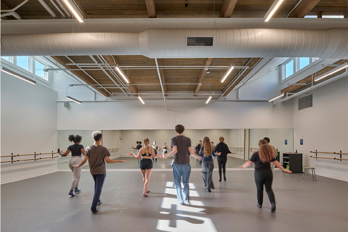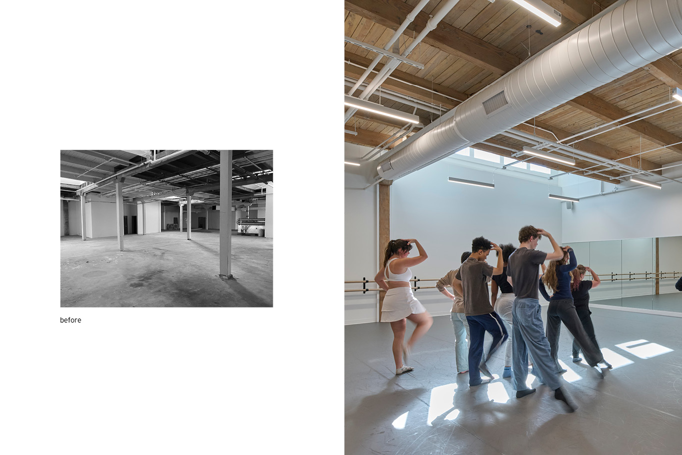 The project capitalized on the large open bays and existing skylights of the historic printing warehouse. Structural modifications included altering the 20-foot grid by removing two columns, thereby creating space for two expansive 40’ x 40’ dance studios.