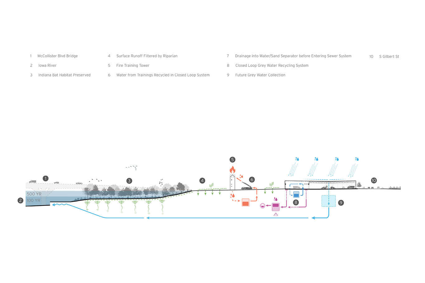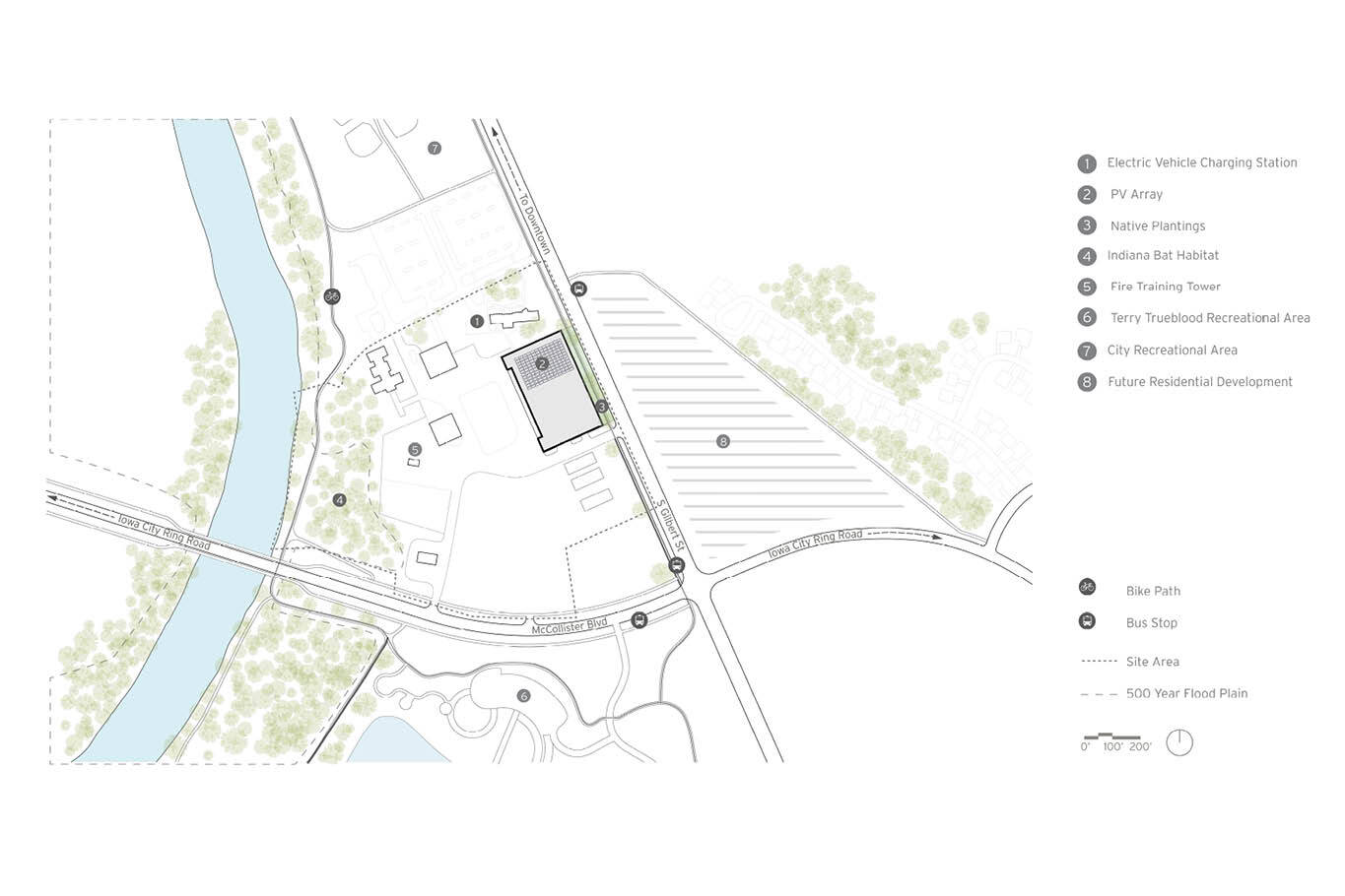 The facility’s east facade faces a residential neighborhood across an arterial just south of downtown. It sets an edge condition for the well-trafficked bike trail that links recreational grounds to the north and south, establishing a civic presence and measured cadence that belies the rough and tumble flexibility that it accommodates deeper into the site.