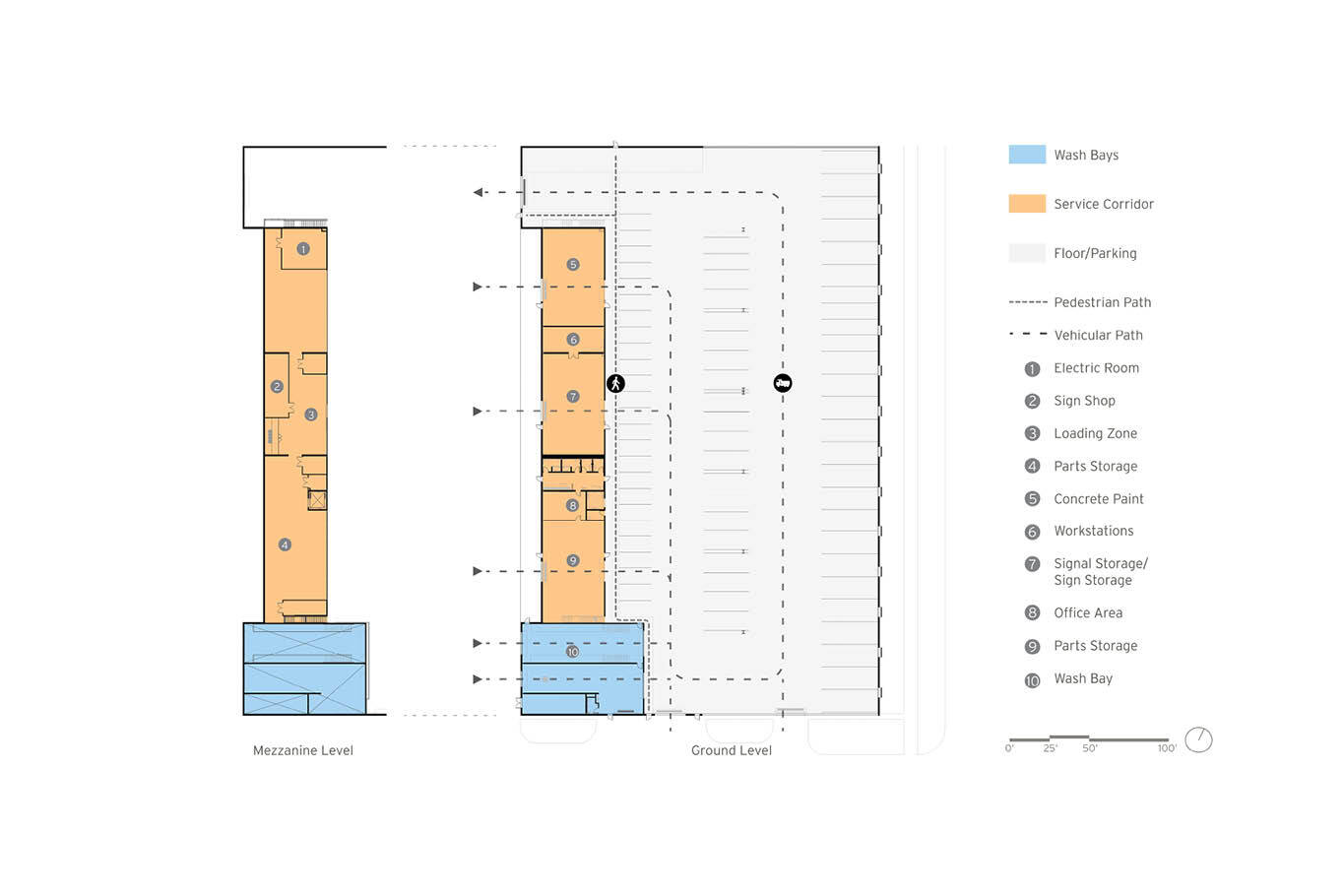 This project represents the ambitious first step in a 14-acre master plan to consolidate and upgrade a scattered set of aging municipal operations. The predominately concrete structure houses the Streets and Water Departments along with their associated vehicles and equipment. Program includes shop space, large-scale storage, mezzanine storage with elevator and forklift access, a fire training tower, fire pump truck training, police and fire storage, and vehicle/equipment wash bays.