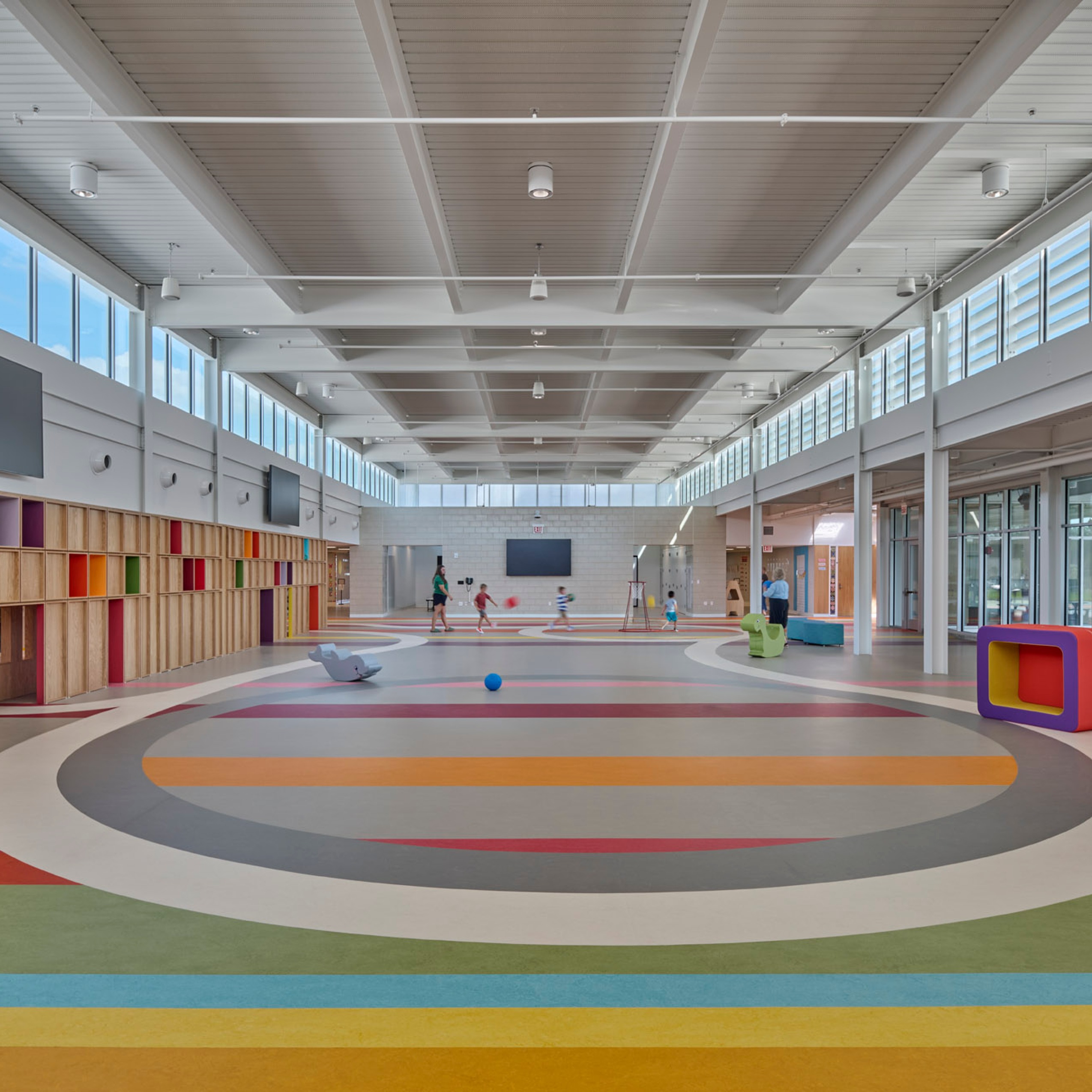 A daylit multi-purpose play space forms the building’s nucleus. Playful casework delineates the north edge of this space and provides storage for teachers and discovery for students. To the south, floor-to-ceiling windows visually connect the multi-purpose space to the protected play porch and playground beyond. These spaces are activated with colors and patterns inspired by tulip fields of the Netherlands, a nod to the town’s rich Dutch heritage.